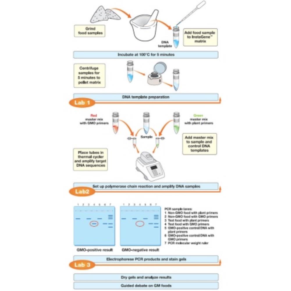 - Use PCR and gel electriphoresis to determine whether the foods contain GMO ingredients