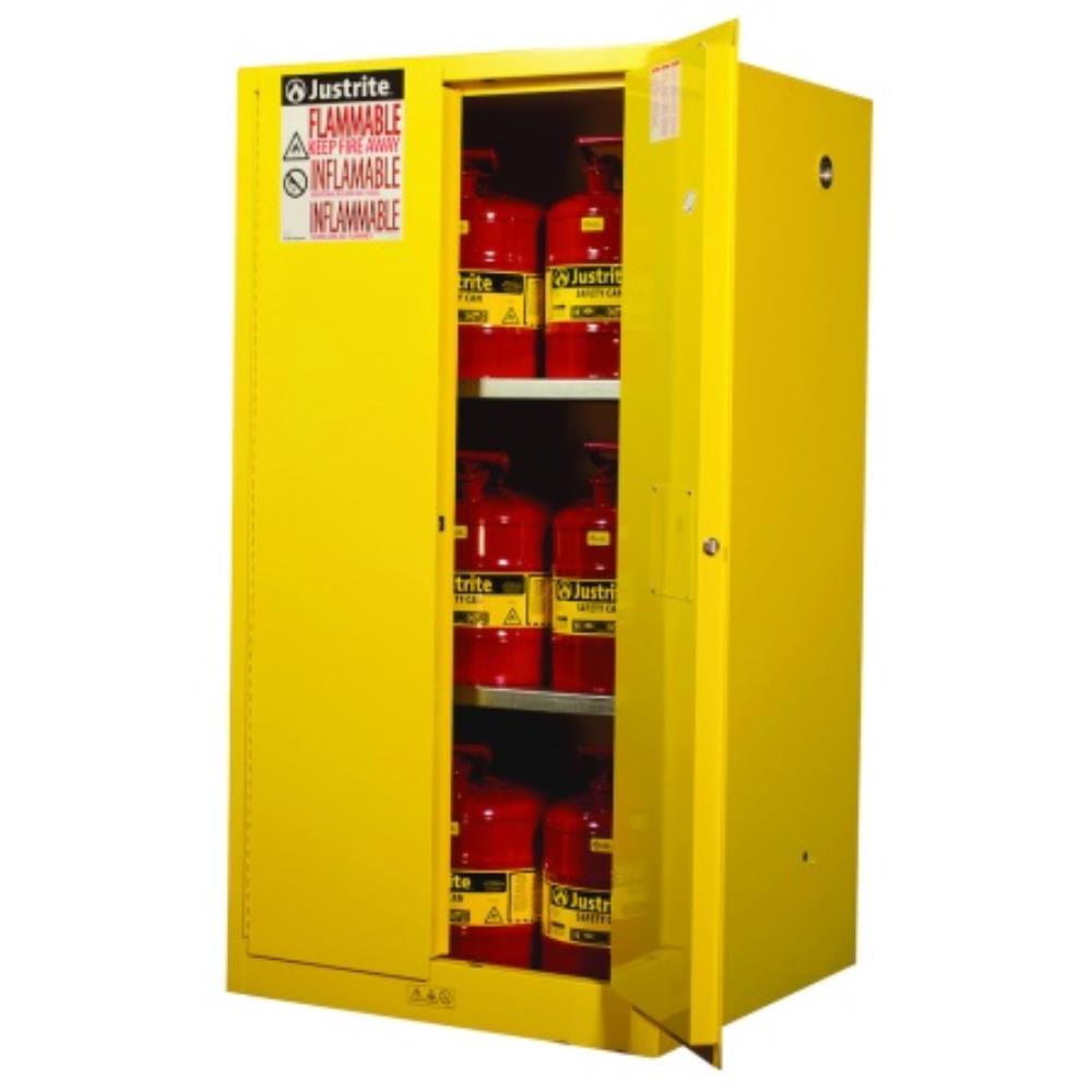 Protect workers, reduce fire risks, and improve productivity by storing flammable fuels and chemicals in code-compliant safety cabinets. Designed to meet OSHA and NFPA standards, Sure-Grip® EX cabinets are constructed of sturdy 18 gauge (1mm) thick double wall, welded steel with 38mm of insulating air space for fire resistance. High performance, self latching doors close easily and securely for maximum protection under fire conditions. Fail safe closing mechanism ensures three point stainless steel bullet latching system works every time