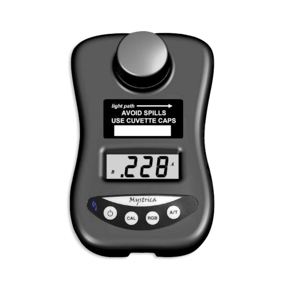 The combination of low cost, ease of use and high performance make the Mystrica colorimeter an ideal instrument for use as class sets, with small groups or for individual projects. The colorimeter can be used as a stand alone instrument to obtain readings of absorbance or transmittance of blue, green or red light, connected to a PC using the USB cable supplied, using Bluetooth 4.0 to connect to a tablet, phone or PC, and with either test-tubes or cuvettes.