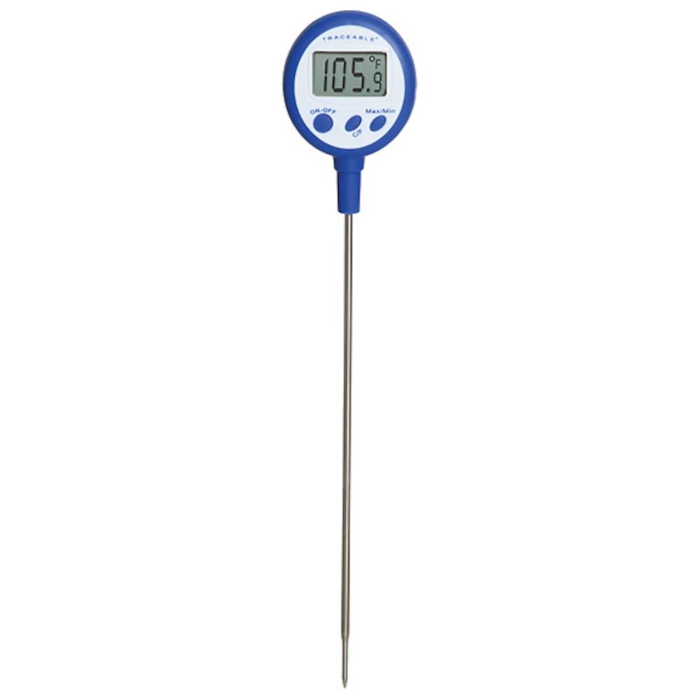 These digital thermometers provide quick results - in two seconds, readings will be within one degree of the actual temperature and are updated every second. Ideal for baths, incubators, or tanks - units are waterproof and shockproof. Features also include an on/off switch, back-lit display, 180° display rotation, and battery-status indicator. The durable stainless-steel probe has a pointed tip for use in air/gas, liquids, and solids/semi-solids. Model 18004-35 features an 8" (20cm) long integrated probe, where model 18004-36 features a 5" (12.7cm) long probe on a 9ft (2.7m) cable.