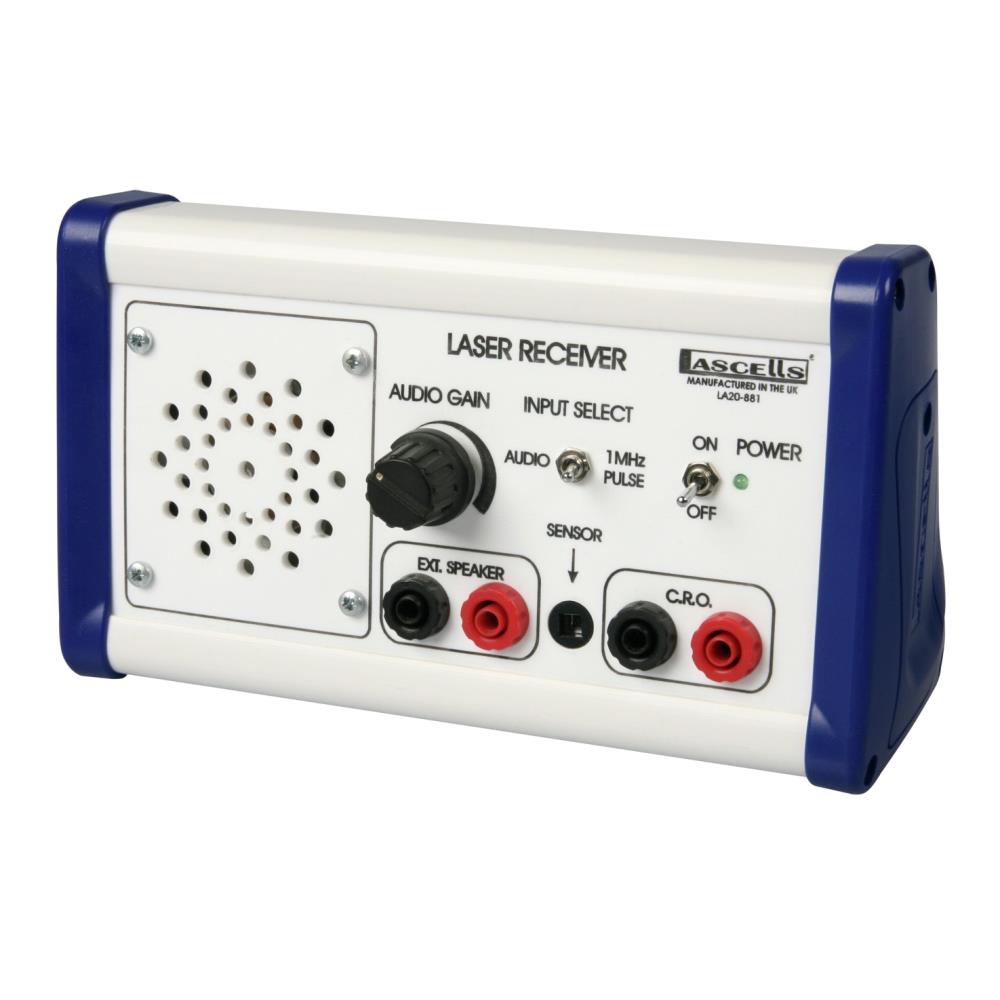 The Lascells semiconductor laser contains two independently controlled laser diodes, one at the standard 650nm red and a second at 532nm green. Both lasers may be simultaneously passed through a double slit slide and both diffraction patterns may be displayed one above the other for an immediate comparison.The unit is equipped with internal 1 MHz modulation which when used in conjunction with the laser receiver and an oscilloscope allows the speed of light to be determined in the laboratory. In addition, the facility to modulate the laser from an external source is provided allowing audio to be sent to the receiver from a smartphone or mp3 player.The apparatus is switched using a removable key which prevents unauthorised use and is supplied with a 9V power supply and full instructions.