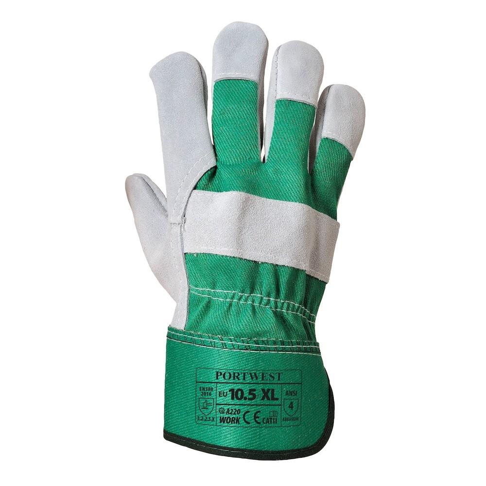 Premium quality split leather chrome rigger with cotton drill back and knuckle protection. Rubberised safety cuff and integral vein patch.