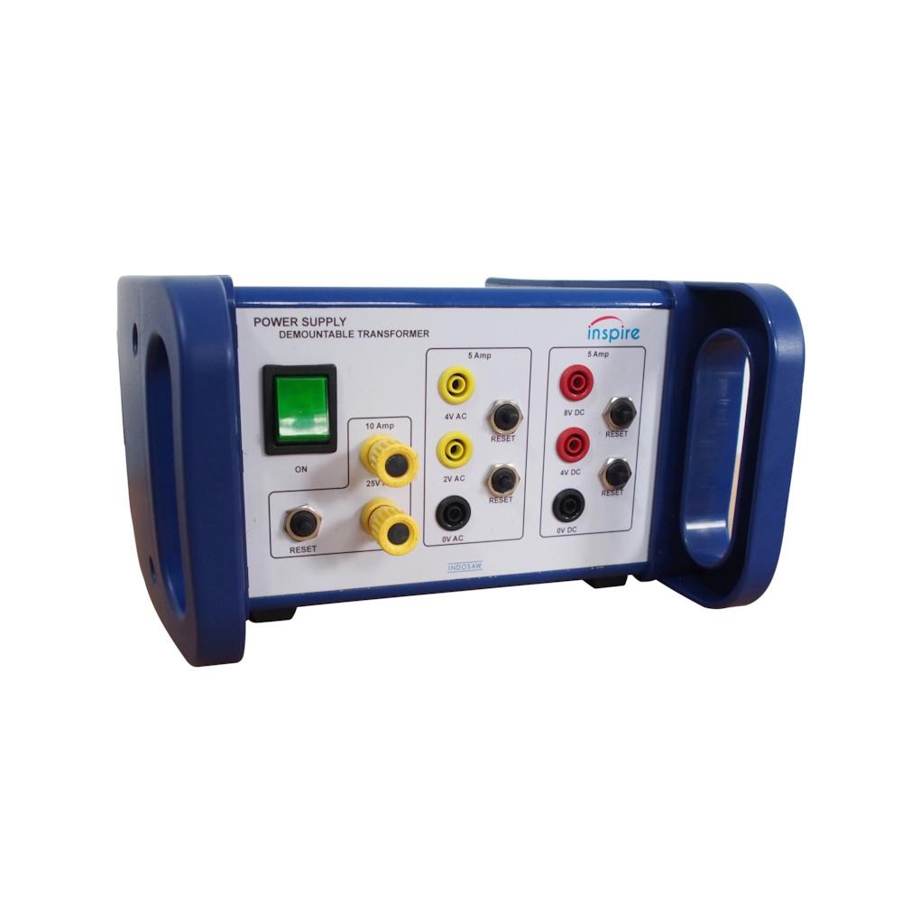 Rather than the traditional mains coil Inspire have designed a dedicated Demonstration Transformer Power Supply with fixed voltage, high current outputs to which 100-turn or 300-turn mains coil substitutes (PY5188), connect. The advantage is that no lethal mains voltage is involved, instead the voltage to these mains coil replacements is 25V AC and so safe. This 25V AC supply is supplied to the mains coil replacements by non-standard connector and so cannot be supplied to standard primary/secondary coil experiments (additional AC and DC outputs are provided up to 4V for standard transformer experiments and other experiments described in the 'Notes for Use'.